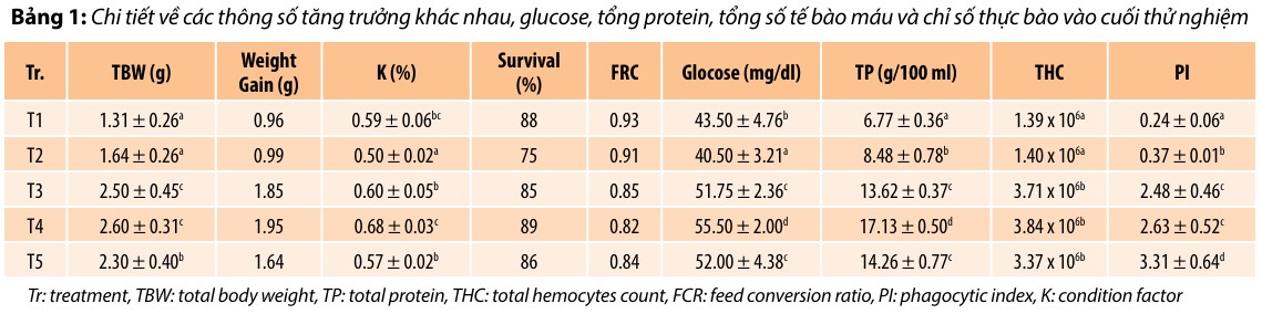 Kết quả Tăng trưởng nước khử ion, sau đó phun lên 1 kg thức ăn thương mại (40% đạm, viên 2 mm), để khô qua đêm và bảo quản ở 4°C. Đối chứng (D1) chỉ được phun ethanol và nước tương ứng. Tôm giống (trọng lượng trung bình 0,65g) được nuôi thích nghi hai tuần trong bể 100 gallon trước khi bố trí vào 15 bể thử nghiệm (5 nghiệm thức, mỗi nghiệm thức 3 lặp). Mật độ thả được thiết lập tương đương mô hình nuôi thâm canh, với số lượng tôm bổ sung để bù hao hụt do chết tự nhiên. Tôm được cho ăn 4 lần/ngày. Thí nghiệm kéo dài 8 tuần. Các chỉ tiêu môi trường nước như nhiệt độ (27 – 28°C), độ mặn (8‰), pH (8.1) và oxy hòa tan (77 – 82%) được theo dõi hàng ngày. Amoniac, nitrit, nitrat đều nằm dưới ngưỡng phát hiện. Các công việc thu mẫu phân tích bao gồm: Lấy mẫu huyết dịch và mô; tách RNA Tăng trọng cao hơn được ghi nhận ở các nghiệm thức T3, T4 và T5, trong đó T4 đạt giá trị cao nhất (Bảng 1). Hệ số điều kiện (condition factor) khác biệt có ý nghĩa thống kê giữa các nghiệm thức (p<0.05) và đều nhỏ hơn 1.00. Hệ số chuyển hóa thức ăn (FCR) ở tất cả các nghiệm thức đều dưới 1.00. Các chỉ tiêu sinh lý bao gồm tổng protein, glucose huyết tương, tổng số lượng hemocyte và chỉ số thực bào (PI) cho thấy sự khác biệt có ý nghĩa (p<0.05) giữa các nghiệm thức, với giá trị cao hơn được ghi nhận ở T3, T4 và T5. Trong đó, T4 thể hiện giá trị cao nhất ở tất cả các chỉ tiêu này.