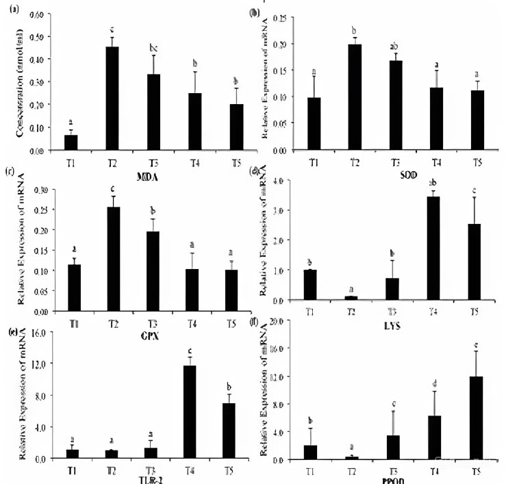 Hình 1. Nồng độ malondialdehyde (MDA) trong máu được đo bằng ELISA (a). Biểu hiện tương đối của mRNA của superoxide dismutase (SOD) (b), lysozyme (LYS) (c), glutathione peroxidase (GPX) (d), thụ thể giống toll-2 (TLR 2) (e) và prophenolperoxidase (PPOD) (f) trong bốn phương pháp xử lý khác nhau (T1, mật độ thả thấp, T2, mật độ thả cao, T3: axit lauric, T4: N-acetylcysteine, T5: axit lauric + N-acetylcysteine. Những phát hiện của nghiên cứu hiện tại khẳng định rằng việc bổ sung NAC và LA (0,2%) vào chế độ ăn của tôm thẻ chân trắng có thể tăng cường khả năng tăng trưởng, chống oxy hóa và phản ứng miễn dịch. Cần phải nghiên cứu thêm để xác định liều lượng tối ưu ở mật độ thả nuôi cao hơn có thể hiệu quả hơn đối với các tác nhân gây bệnh nuôi trồng thủy sản phổ biến. Thật không may, do hạn chế sử dụng vi khuẩn gây bệnh trong phòng thí nghiệm, nghiên cứu hiện tại không thể đưa các phương pháp xử lý vào cảm nhiễm với vi khuẩn độc lực. Các nghiên cứu trong tương lai có thể khám phá những khía cạnh này, điều này sẽ có lợi trong việc tăng cường phản ứng chống oxy hóa và miễn dịch của tôm thẻ chân trắng Thái Bình Dương trong nuôi thâm canh.